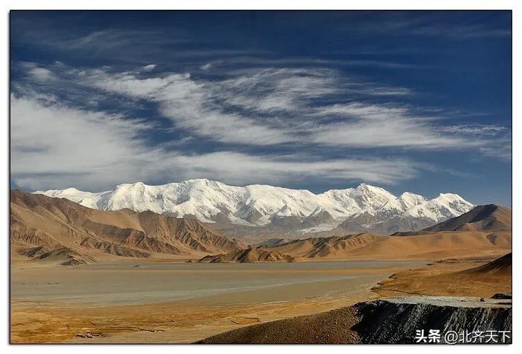 9.公格尔九别(Kongur Tiube Tagh),海拔7530米,还有7595的数据。公格尔九别是世界第四十六高峰,中国第二十高峰,完全在中国境内的第九高峰。九别的全称应该是公格尔九别塔格,在当地语言中的意思是“戴白帽子的山”。九别是帕米尔的第二高峰,也是昆仑山系的第二高峰,仅次于其东南方十公里的公格尔,不过由于多种数据的存在,也有些地方将慕士塔格看作昆仑第二高峰。九别虽然比公格尔主峰低一百多米,但气势却并不输于主峰,一方面因为它距离围绕公格尔峰区北-西的314国道更近,更主要是因为它那长达十几公里的巨大山脊如同一堵墙一样横亘天际,视觉冲击力非常强。