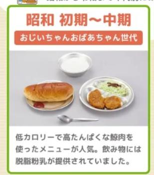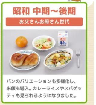 从昭和中期 ~ 后期(1957 年 ~1989 年),爸爸妈妈那一代,学校午餐是种类丰富的面包、米饭、咖喱饭、意大利面、水果和蔬菜沙拉。