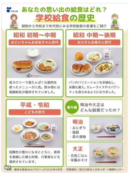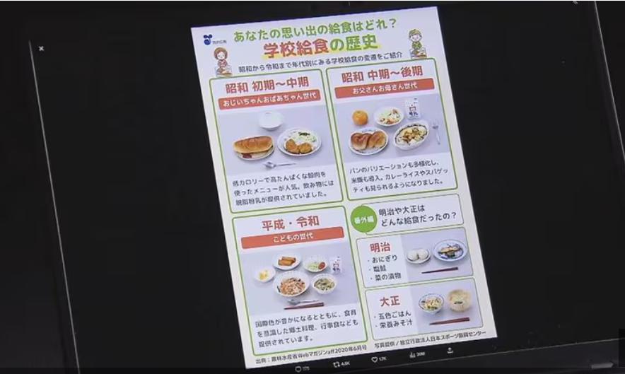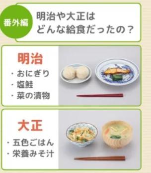 照片中介绍了从明治、大正时代到令和年日本学校午餐的演变情况。