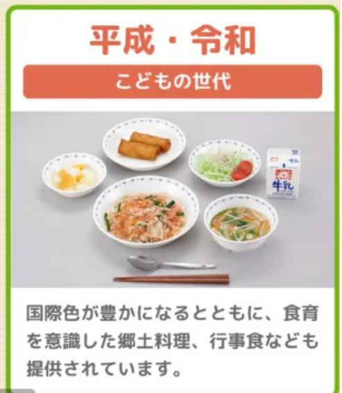 平成、令和年代(1989 年 ~ 如今)学校的午餐变得尤其丰富。还添加了国际化的色彩。除了日本的本土料理外、中国的春卷和其他国家的食材也会加入其中。