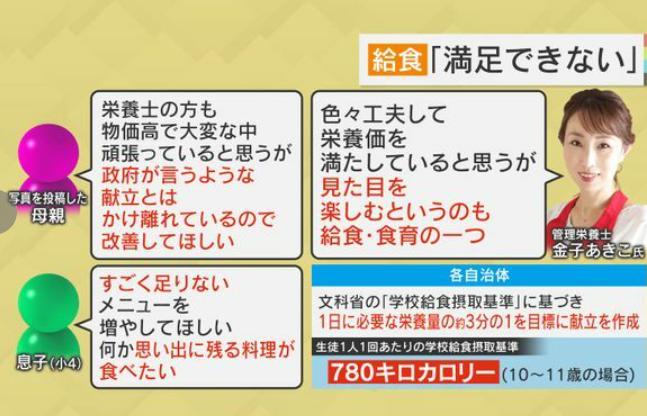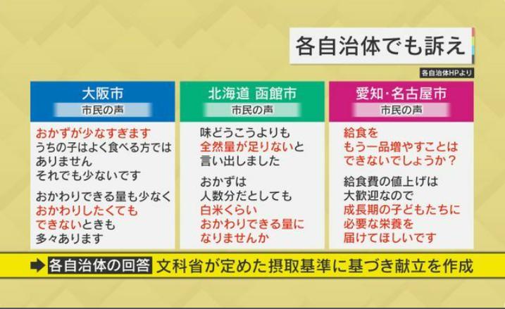 大阪市民说," 学校配菜太少了。我的孩子是那种不爱吃饭的类型。就算这样,连他都不够吃。有时加饭很少有时甚至都不能加饭。"