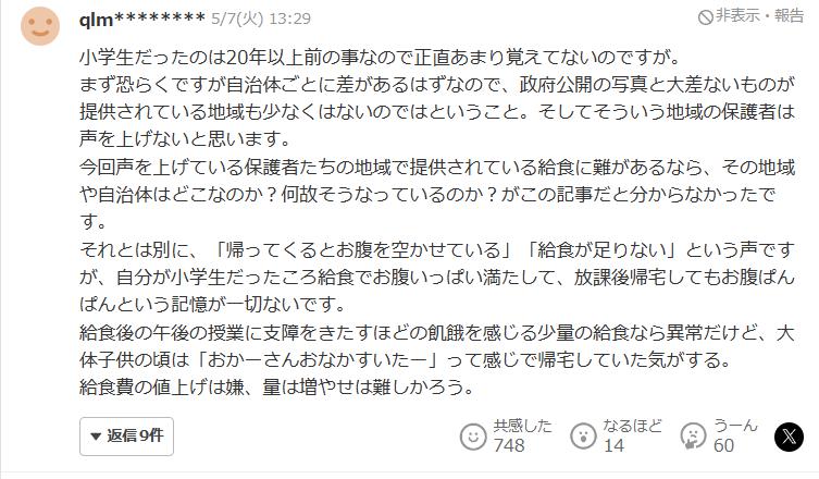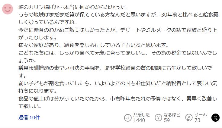 炸鲸鱼块,我真的不知道那是什么东西。我觉得我们这个地区仍然保持着高质量的午餐,但与 30 年前相比,学校午餐越来越冷清了。我还是会和家人一起兴奋地谈论以前学校午餐的裙带菜饭有多好吃,或者甜点和牛奶调味料。这个社会上有各种各样的家庭,有些孩子对学校午餐充满期待。我希望孩子们吃得好,健康成长,这不正是纳税的目的吗?我希望在解决午餐质量问题上就像通过增加议员报酬那样迅速和效率。作为纳税人,我感到悲哀的是,如果弱势儿童开始吃不上饭,这个国家终将走向灭亡。我们知道食品价格上涨,所以我希望市政府能尽快做出改善,而不是仅仅延续去年的预算。