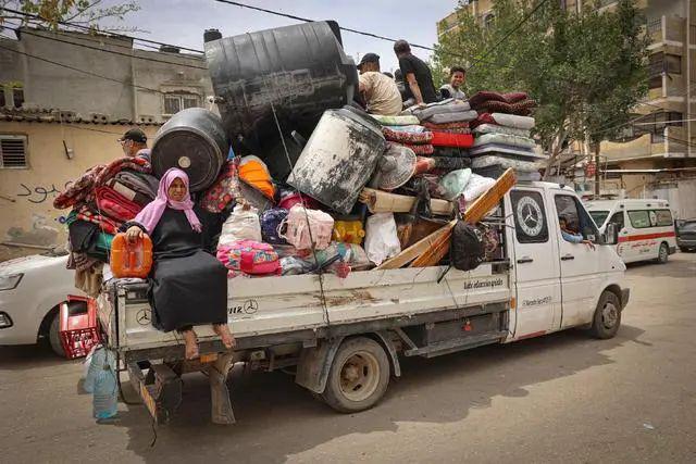 当地时间 2024 年 5 月 6 日,在加沙地带南部城市拉法,巴勒斯坦人带着所有的行囊离开家园。