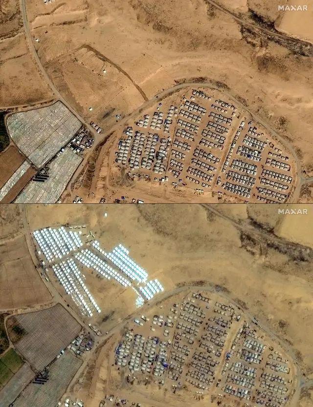 卫星图像显示在加沙地带南部拉法地区,流离失所者帐篷营地数量增加。