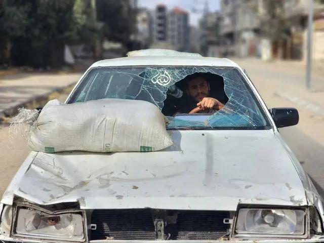 当地时间 2024 年 5 月 12 日,加沙拉法,以色列对拉法发动袭击,一名巴勒斯坦人开着破烂的汽车带着行李逃离。