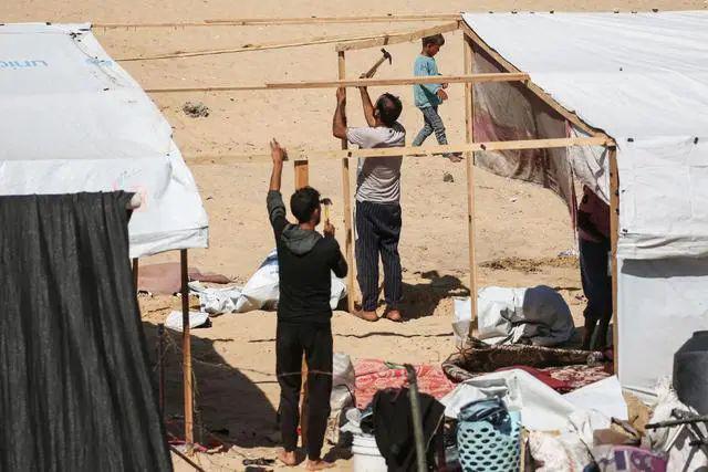当地时间 2024 年 4 月 30 日,加沙地带南部拉法,巴以冲突持续,流离失所的巴勒斯坦人在当地搭建帐篷落脚居住。