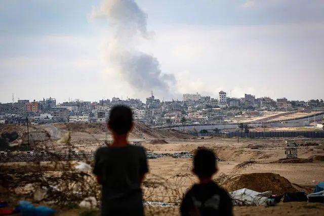 当地时间 2024 年 5 月 13 日,加沙地带拉法,巴以冲突持续,男孩们在以色列空袭中看着远处滚滚的浓烟。