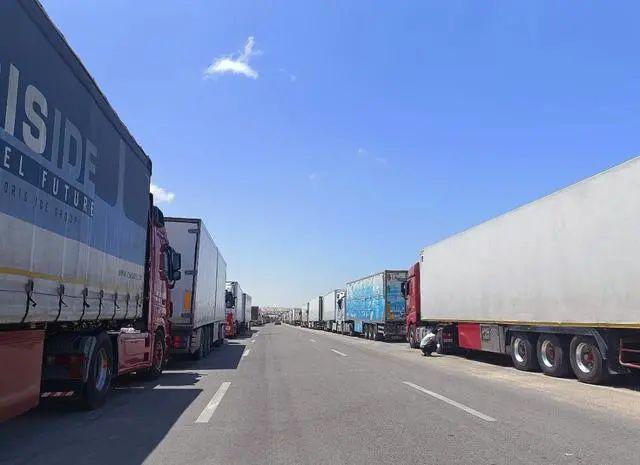 当地时间 2024 年 5 月 7 日,埃及拉法过境点,在以色列军队宣布控制了拉法口岸加沙地带一侧后,数十辆满载人道主义援助物资的卡车等待从埃及的拉法过境点进入加沙。