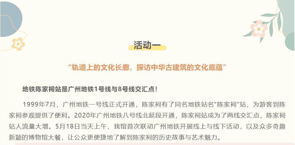 看点:5 月 18 日 8:30-12:00,该馆与广州地铁运营事业总部运营—中心车站服务一部长寿路中心站举办 " 轨道上的文化长廊,探访中华古建筑的文化底蕴 " 线上线下活动,让公众更便捷地了解到陈家祠的历史故事与艺术魅力。