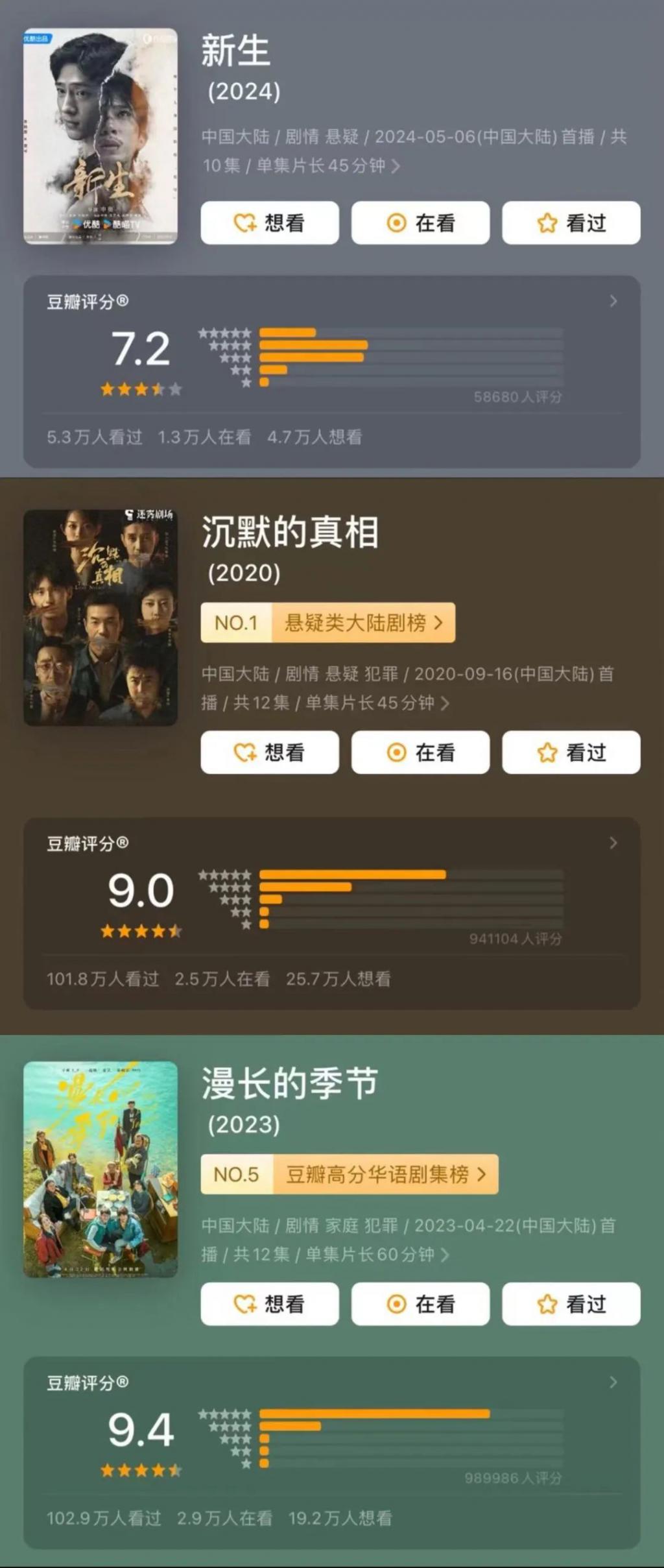 目前,《新生》在评分网站上有 5.8 万人评分,评分为 7.2 分,相比于《沉默的真相》《漫长的季节》等 9 分高分悬疑剧来说,尚有较大差距。