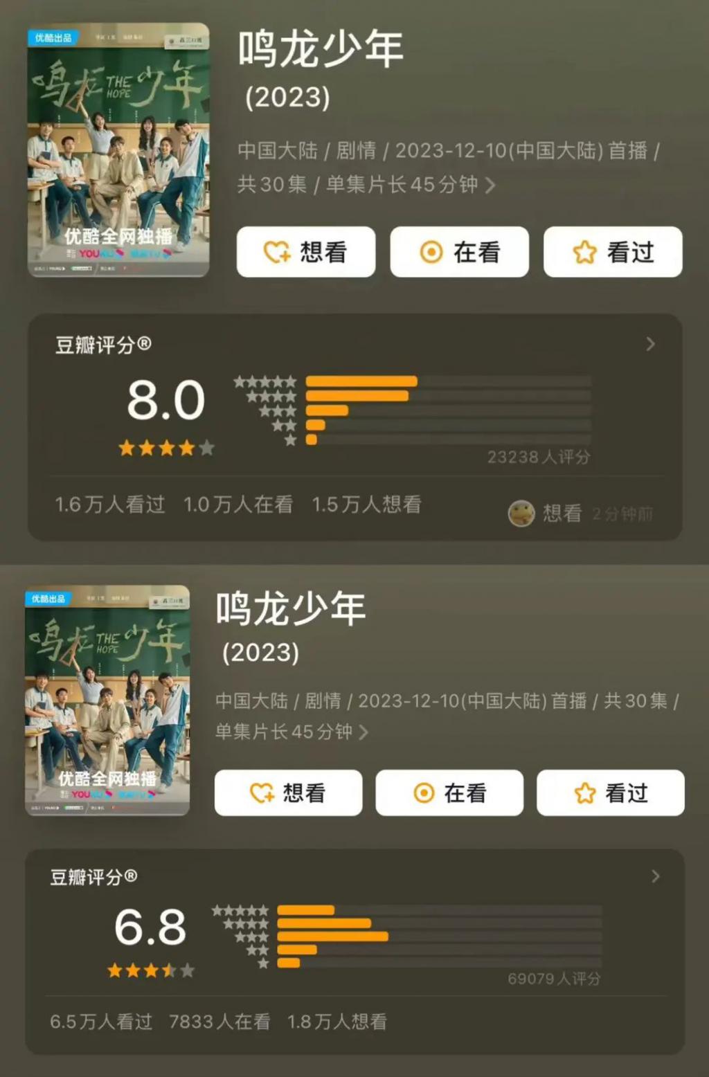 今年伊始,由张若昀、黄尧主演的开年大剧校园剧《鸣龙少年》,因为剧情 " 崩塌 "、结局 " 烂尾 " 被骂 " 你个癫剧 ",评分也从开播时的 8 分下降至 6.8 分。
