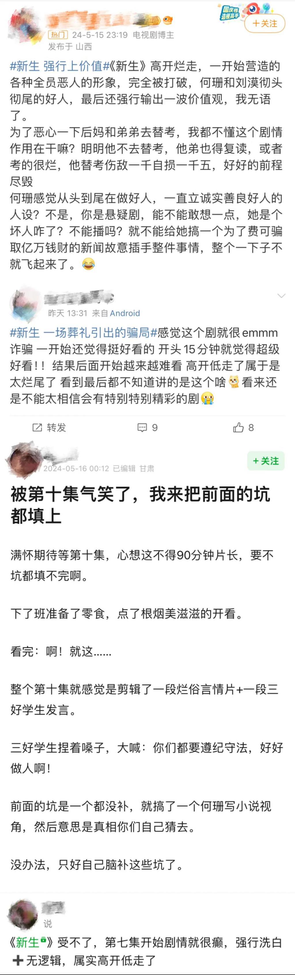 然而在七集后,因为剧情走向不明,观众对此剧的好评度下降,直至昨晚播出第十集大结局,因为剧情 " 烂尾 ",观众将《新生》骂上热搜。