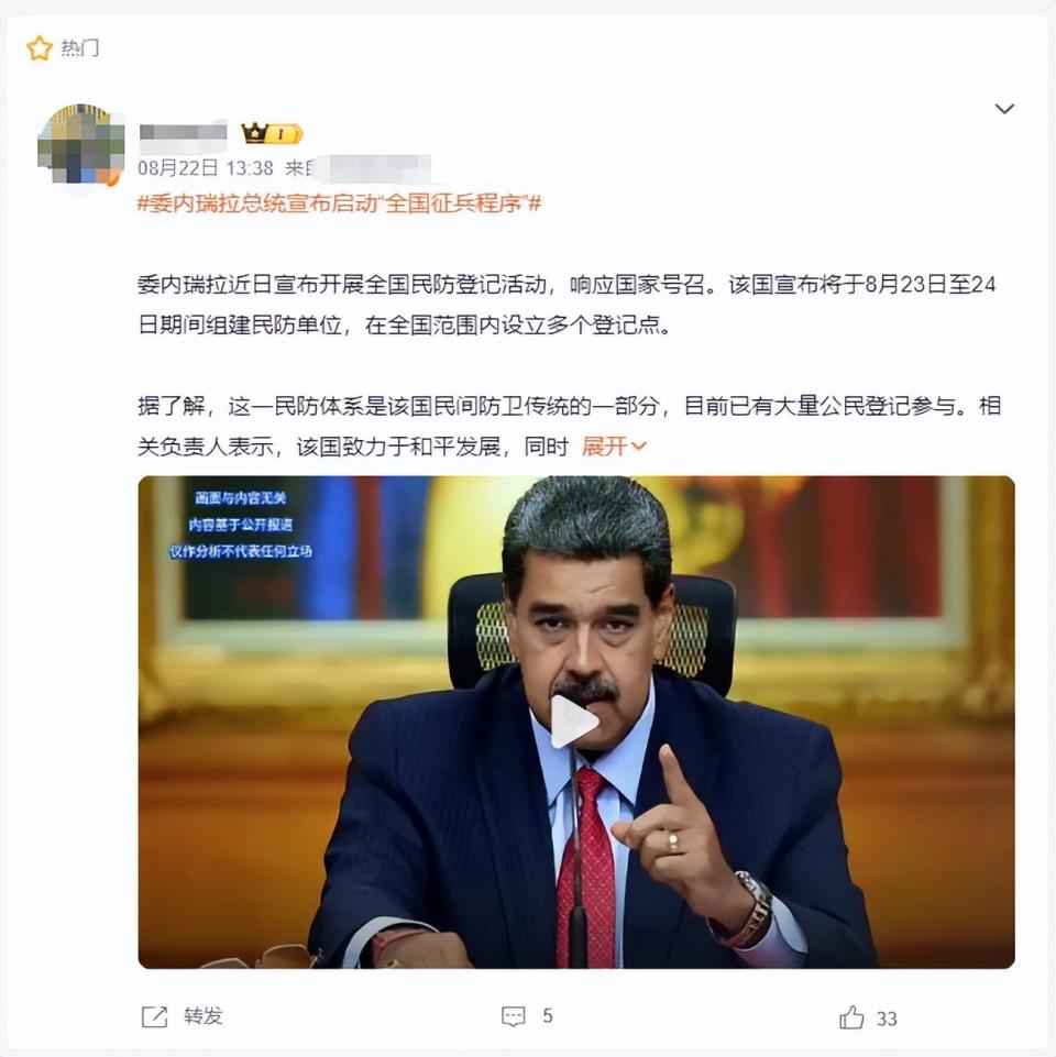 马杜罗方面,为了应对可能到来的危机,也已经开展全国征兵活动。他表示,玻利瓦尔民兵已拥有超过 450 万公民完成登记并参与各项计划。按照总人口来看,这基本上算是全民皆兵了。