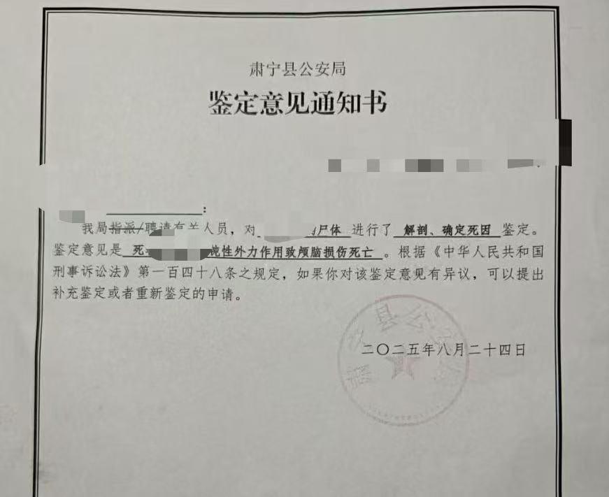 8 月 24 日,肃宁县公安局出具鉴定意见通知书,称死者系钝性外力作用致颅脑损伤死亡。
