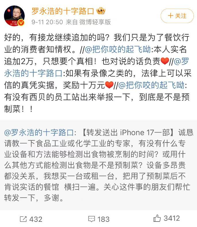 9 月 10 号,罗永浩发了条微博,说西贝都是预制,价格还贵,很恶心,呼吁强制餐厅注明预制菜。