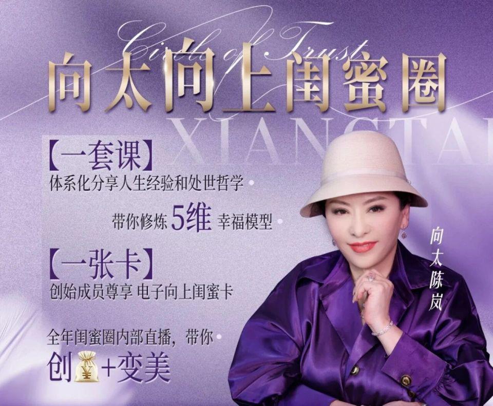 紫色缎面上衣配浅黄礼帽,中国香港制片人、中国星集团副主席 " 向太 " 陈岚,近期以一身高调行头出现在一张线上课程的海报上。