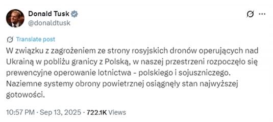 △ 13 日,波兰总理图斯克在社交平台 X 上发帖称,波兰及其盟友已在本国领空展开 " 预防性 " 空中行动。