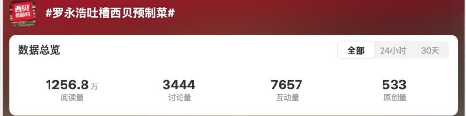 截至 9 月 13 日,# 罗永浩吐槽西贝预制菜 # 话题阅读量已达到千万,相关话题纷纷登上热搜,数百万网友参与讨论,其中不少网友认为 " 餐厅用预制菜必须明说,不然就是欺骗 "。