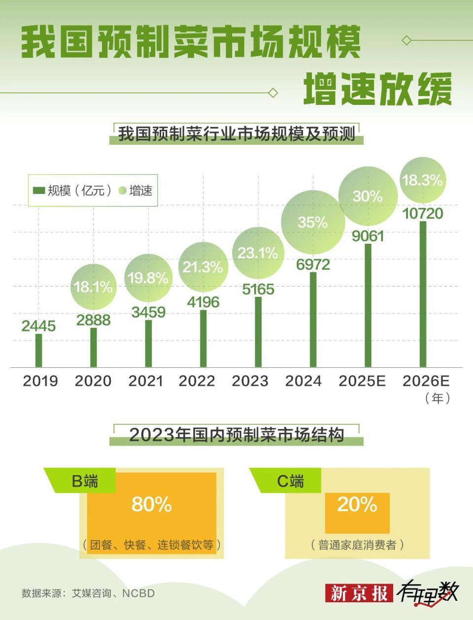 但热闹的背后,预制菜的增长脚步变慢了。行业数据显示,我国预制菜市场规模逐年扩张,并有望在 2026 年突破 10720 亿元。但从增速看,2024 年预制菜市场增速达到 35%,预计在 2026 年跌至 18.3%。目前,国内的预制菜行业主要市场是团餐、连锁餐饮等 B 端企业,普通消费者的家庭消费中,预制菜仍是小比例。