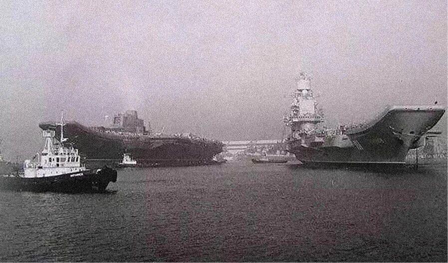 当年在黑海之滨的未完工的 " 瓦良格 " 号(左)和 " 库兹涅佐夫海军上将 " 号。