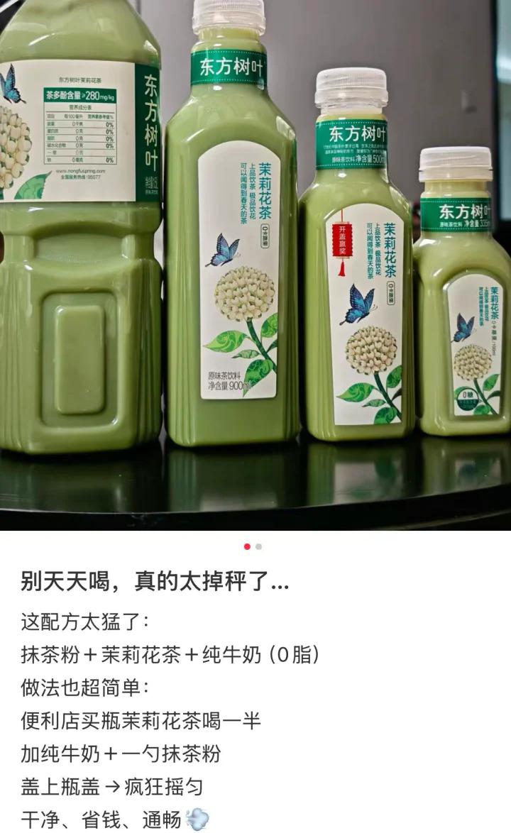 绿茶搭牛奶是 " 平价版伯牙绝弦 ",乌龙茶加纯果汁是 " 冰摇桃桃乌龙 " 和 " 冰摇红梅黑加仑 ",陈皮普洱混可可粉 " 简易戒暴神器 ",就连最冷门的玄米茶,也被用来搭配无糖豆浆,做成 " 液断版女团水 "。