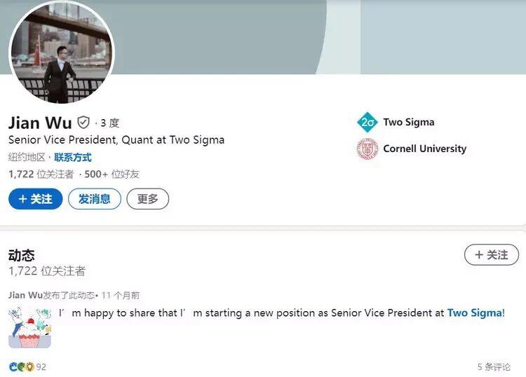 名校毕业的吴舰曾在美国知名做市商 Citadel(城堡投资)实习,于 2018 年 4 月加入顶尖量化对冲基金 Two Sigma,从量化研究员做起,三年时间不到就升任 Two Sigma 量化研究部的副总裁,2023 年 1 月,工作不到五年的吴舰被提拔为高级副总裁。