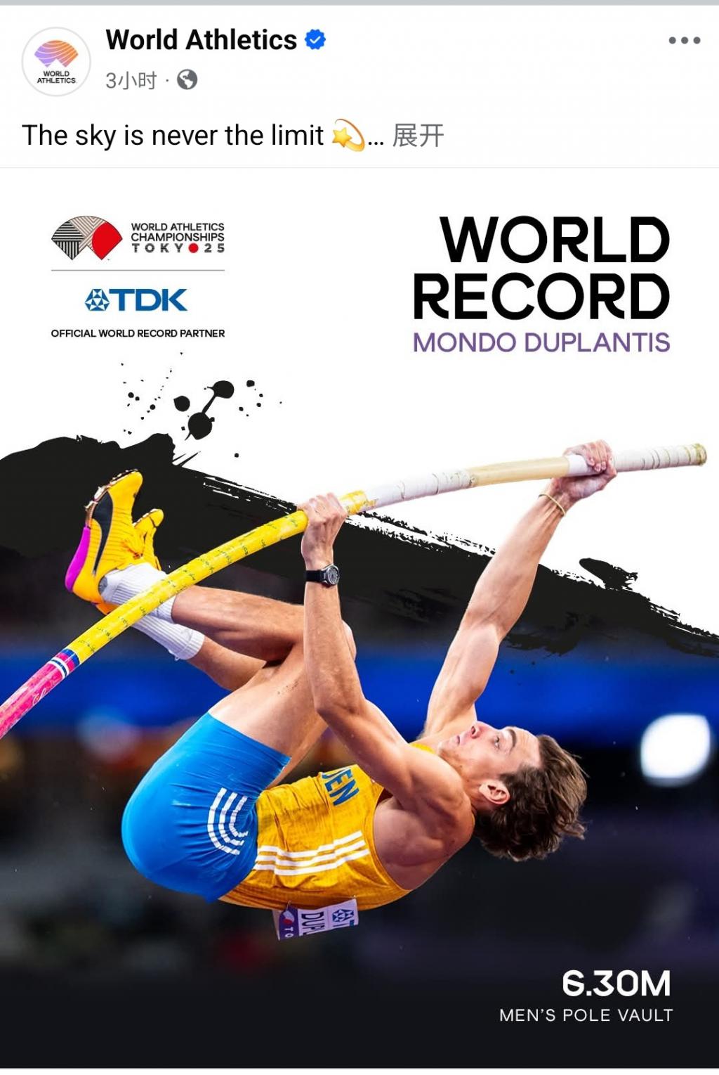 世界田联则在官方社交媒体写到:天空从来不是极限,杜普兰蒂斯再次证明了他来自另外一个星球,他轻松跨越了 6 米 30 的高度,打破了自己保持的世界纪录,并获得了他的第三个田径世锦赛冠军!
