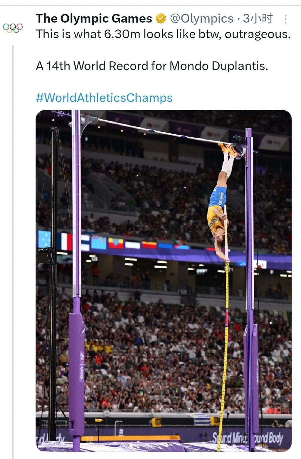 国际奥委会赛后第一时间在官方社交媒体发布了一张杜普兰蒂斯跃过横杆时的照片,配文称:这张图能让你直观地感受 6 米 30 的高度有多高,这太离谱了!这就是杜普兰蒂斯!第 14 次打破世界纪录!