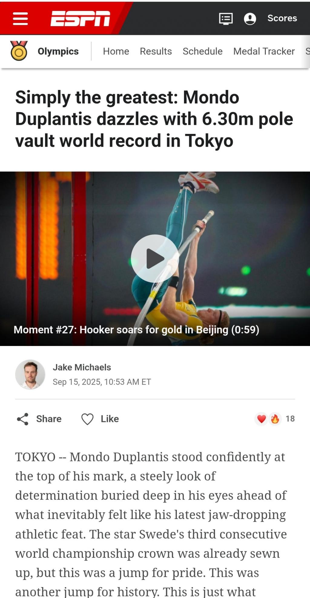 娱乐体育节目电视网(ESPN)官网文章的标题使用了“最伟大的运动员”(The greatest)的称谓,文章写到:“杜普兰蒂斯成为历史上第一个跳过 6 米 30 的人,这是荣耀一跳,也是历史性的一跳!”
