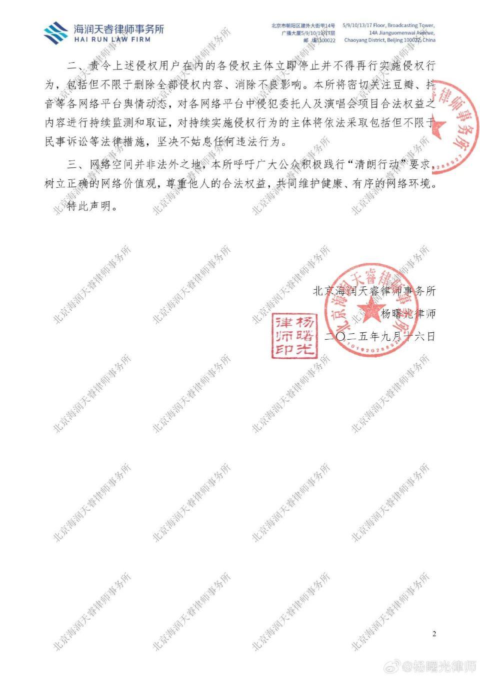 律师声明指出,委托人发现,自委托人演唱会项目开展以来,部分网络用户在各类网络平台中发布、传播针对委托人及演唱会项目的大量不实信息,对委托人演唱会项目中由演唱会主题延展的周边互动行为及正常艺术编排、表现形式等进行无事实依据的恶意解读,强行与封建迷信等内容关联,编造虚假信息,并通过视频、文字等形式在网络上广泛传播,刻意引导社会公众对委托人形象及演唱会项目产生负面评价,且部分用户存在通过捏造、散布上述不实内容吸引流量、增加关注度,进而牟取非法商业利益的情形,情节恶劣,造成委托人名誉、演唱会项目声誉损害的严重负面影响。