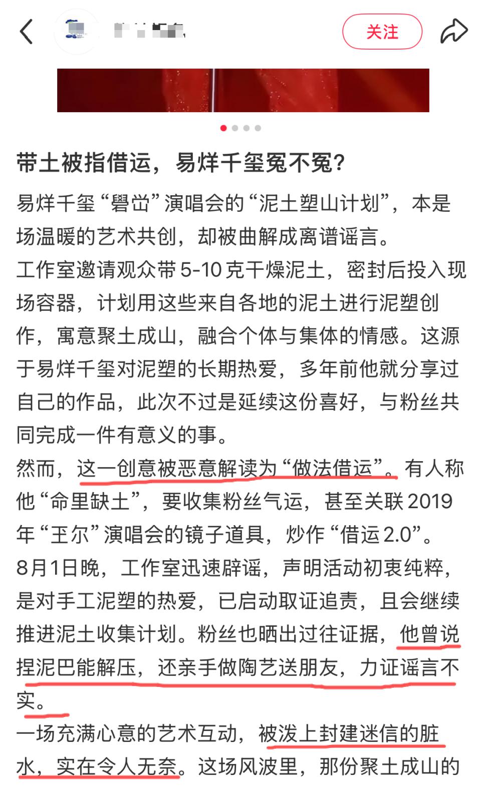 今年 8 月 1 日,@易烊千玺 JacksonYee 工作室曾发布邀请观看 " 礐嶨 " 的观众带来一小撮 " 土 ",随后有部分网友解读为 " 做法借运 "。