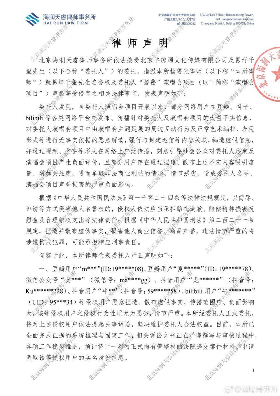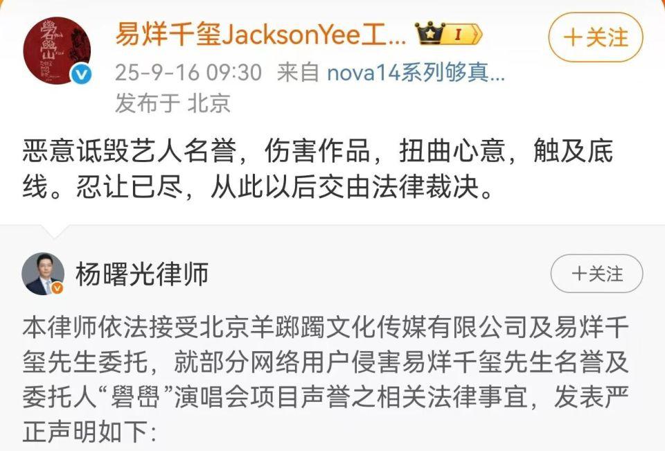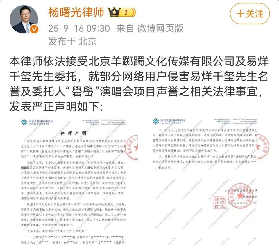 9 月 16 日,杨曙光律师在社交平台发布律师声明:本律师依法接受北京羊踯躅文化传媒有限公司及易烊千玺先生委托,就部分网络用户侵害易烊千玺先生名誉及委托人 " 礐嶨 " 演唱会项目声誉之相关法律事宜,发表严正声明。