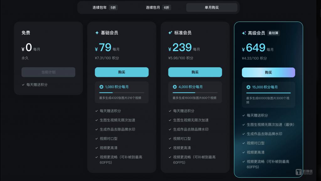 即梦 AI 收费整体相对较便宜,定价分为三档,基础会员、标准会员、高级会员的月费分别是 79 元、239 元、649 元。