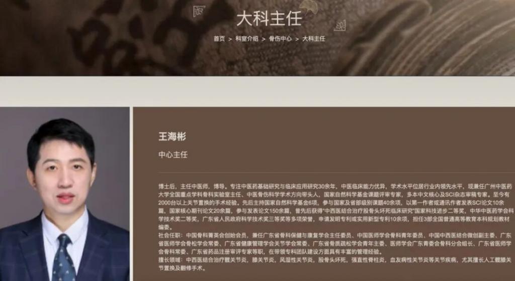 医院官网显示,王海彬,男,1971 年 4 月出生于山东,博士,博士后,博导,为该院骨科主任中医师。专注中医药基础研究与临床应用研究 30 余年,现兼任广州中医药大学全国重点学科骨科实验室主任、中医骨伤科学学术方向带头人,国家自然科学基金课题评审专家,多本中文核心及 SCI 杂志审稿专家。至今有 2000 台以上关节置换的手术经验。其所在的科室在华南地区年手术量位居前列,许多疑难病例慕名而来。