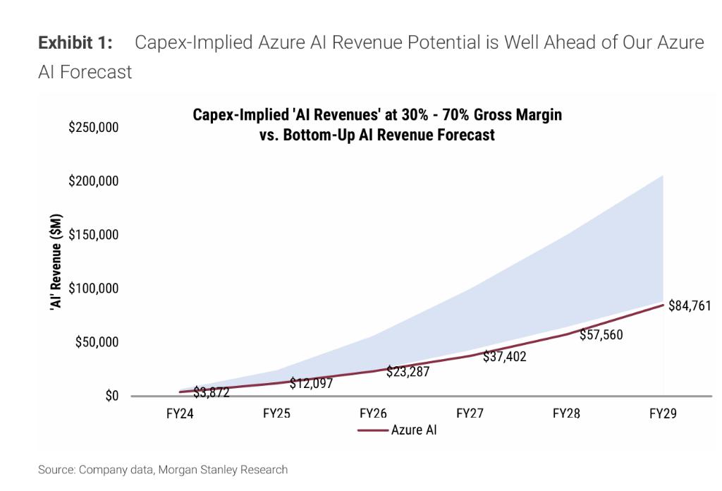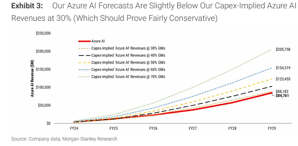根据摩根士丹利推算,微软过去几年和未来的 AI 相关资本开支持续提升,Azure AI 业务有望在 2025 财年达到 104 亿美元收入,并在 2029 财年突破 200 亿美元水平。计算显示,即便只考虑 30% 毛利率场景,对应的 Azure AI 收入潜力远高于当前保守估算。