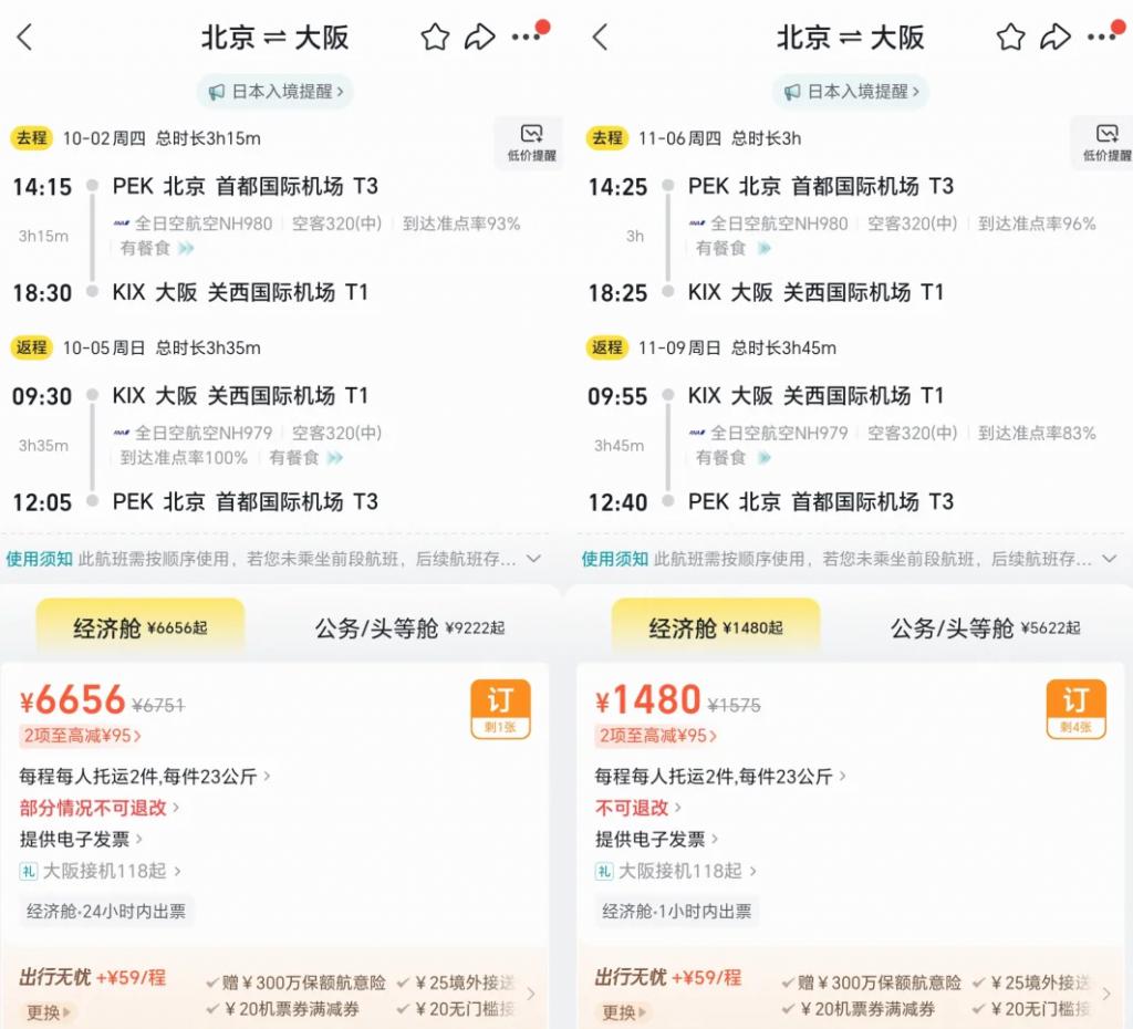 另一类是长线出境游客,发现机票已经呈现近几年前所未有的天价机票,北京欧洲经济舱机票直逼 3 万元,也有人对比北京—大阪的机票,比平时直接翻 4 倍还拐弯了,连连感慨假日经济太可怕了。