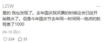 除了怒骂航司、平台大数据杀熟的,也有网友质疑十一机票套路变化,称 " 去年国庆我买票的时候这会已经开始跳水了,但是今年国庆节去年同一时间、同一地点的航班贵了 1000 元!"