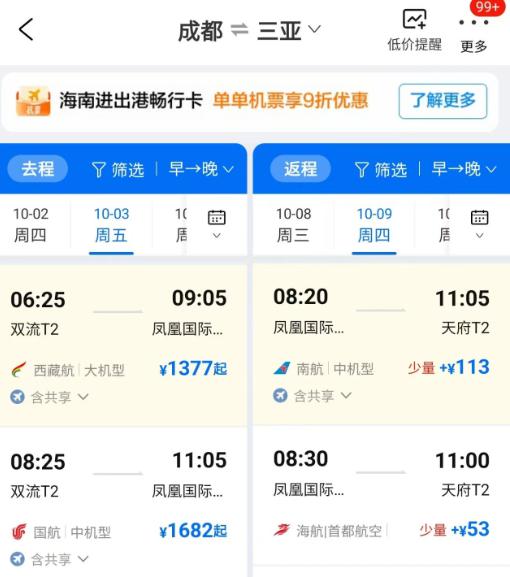 或许是节中的微错峰,以成都 - 海口、三亚等地的机票为例,旅界查询发现 10 月 3 日出行,10 月 9 日返程,往返机票可以控制在 1500 元以内。