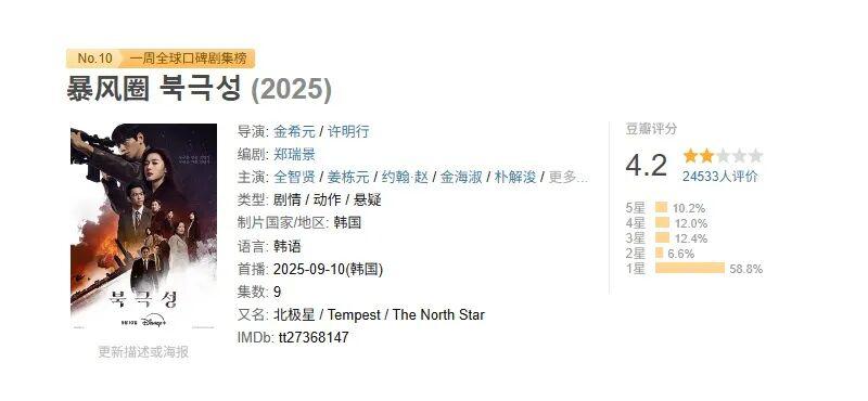 在舆论与商业的双重反噬下,《暴风圈》本身的口碑也彻底崩盘。其豆瓣评分从开分时的 7.1 一路暴跌至 4.2,超过 60% 的观众打出一星评价。这部集结了顶级资源的 " 野心之作 ",在中国市场遭遇了全面溃败。