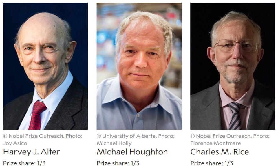 2020 年诺贝尔生理学或医学奖的获奖者是:Harvey J. Alter、Michael Houghton、Charles M. Rice,他们因发现丙型肝炎病毒而获奖。
