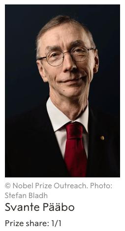 2022 年诺贝尔生理学或医学奖的获奖者是 Svante Pääbo,他因在已灭绝的人类基因组和人类进化方面的发现而获奖。