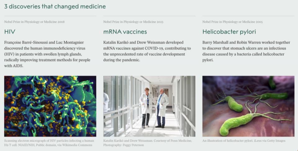 诺贝尔奖官网网站首页列举了三项改变医学的发现:HIV、mRNA 疫苗 和幽门螺杆菌。