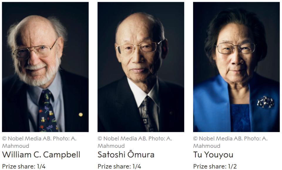 2015 年诺贝尔生理学或医学奖的获奖者是 William C. Campbell、大村智、屠呦呦,前两人因发现治疗丝虫寄生虫新疗法而获奖,屠呦呦因发现治疗疟疾的新疗法而获奖。