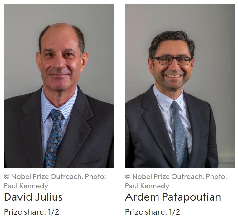 2021 年诺贝尔生理学或医学奖的获奖者是 David Julius、Ardem Patapoutian,他们因发现了温度和触觉感受器而获奖。
