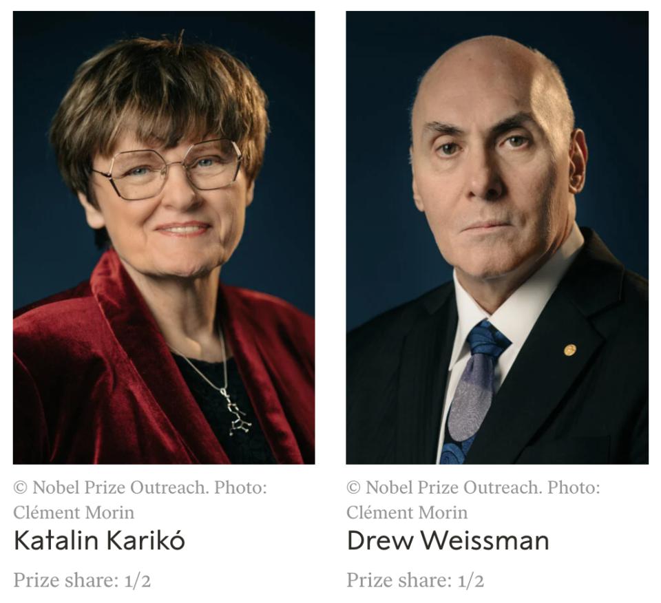mRNA 疫苗:Katalin Karikó 和 Drew Weissman 研发出了对抗 COVID-19 的 mRNA 疫苗,为大流行期间疫苗研发的空前速度做出了贡献。