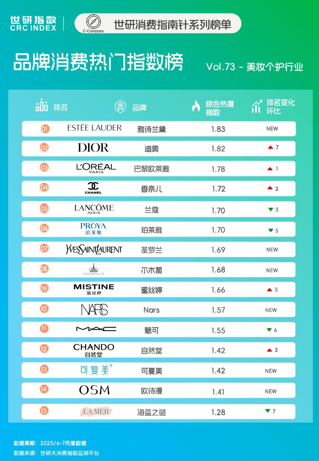 本次监测周期内,美妆护肤品牌雅诗兰黛、迪奥和巴黎欧莱雅分别以 1.83、1.82、1.78 的综合热度位列榜单综合热度前三。