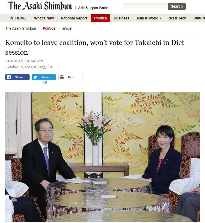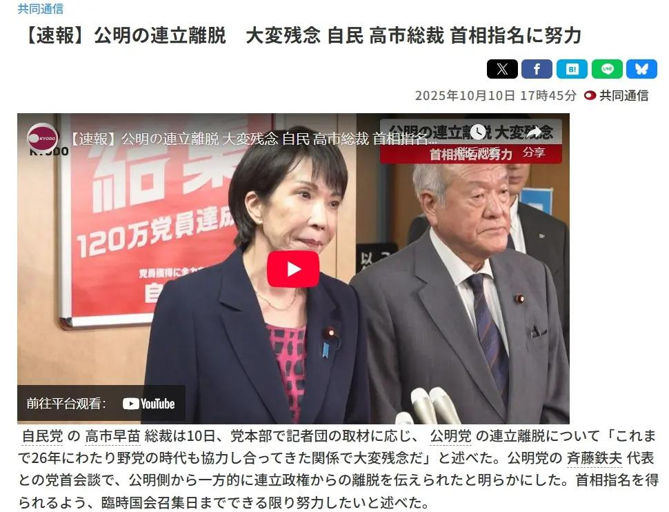 日本公明党 10 日正式向自民党传达了退出执政联盟的决定。这意味着,自民党新任女总裁高市早苗成为日本首任女首相之路横生变数。