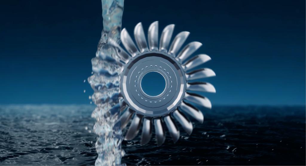 一滴水,从高处下落。摔到一架小水轮上,重力势能转换为动能,会带动扇叶旋转一点点距离。来更多的水,扇叶会旋转得越来越快。加大扇叶,同时加水,现在你有了一架水轮机。