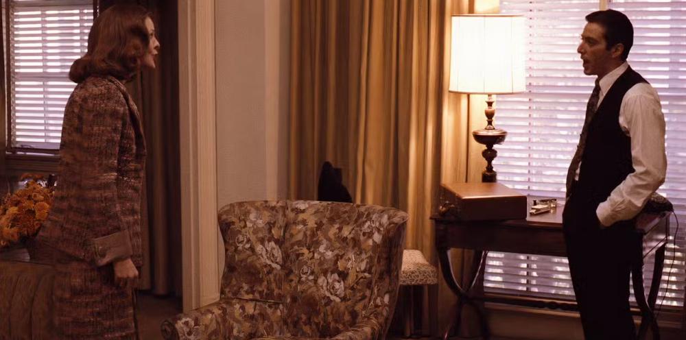 迈克尔从西西里归来后,主动找到了凯,并向她求婚。这场戏在情感上更多是交易性的,而非浪漫的。基顿在表演凯最初的抗拒时,展现出一种安静的坚定,她的声音低沉,目光稳定。当迈克尔最终说出「我爱你」时,基顿让一丝脆弱感突破了她的防线。