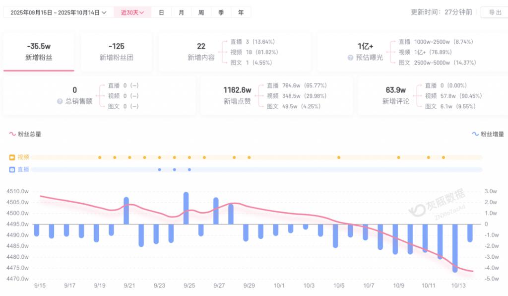 值得注意的是,近期雷军粉丝数持续下滑,灰豚数据显示,雷军近 30 日掉粉 35 万,日均掉粉 1 万多。10 月 13 日事发当日,雷军粉丝数为 4479 万,截至发稿,雷军抖音粉丝数为 4473 万,不到两日掉粉 6 万。